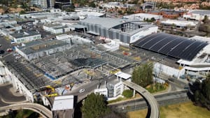 Covering almost 70,000 square metres of parking space and other amenities, the super basement extends 20 metres below ground level. This meant that the basement floor was 12 metres below the water table, creating significant groundwater and rainwater challenges. Hard rock conditions were also encountered and required controlled blasting and other excavation to reach the required levels.