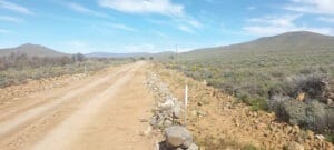 Survey poles demarcate the road servitude at the Karreebosch Wind Farm facility, reinforcing Concor’s commitment to sustainable development and environmental stewardship.