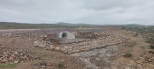 Pipe culvert with gabion baskets installed at the Karreebosch Wind Farm facility to ensure stable drainage and protect against erosion.