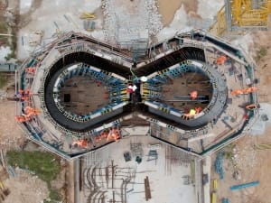 These two legs make up the first 20 metres of the inverted Y shaped pylon, says CMEJV project director Laurence Savage, and are built without any lateral support as free cantilevers. Once completed four lanes of vehicles and a pedestrian walkway on either side will pass beneath these legs at the start and end of the bridge deck.