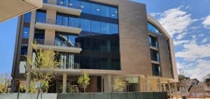 The eastern facade on Building 3 showing the curtain wall flush glazing.