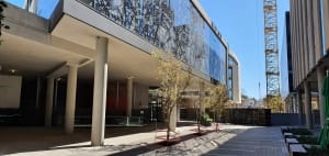 The eastern facade of Building 5 with its fritted facade and external landscaping.